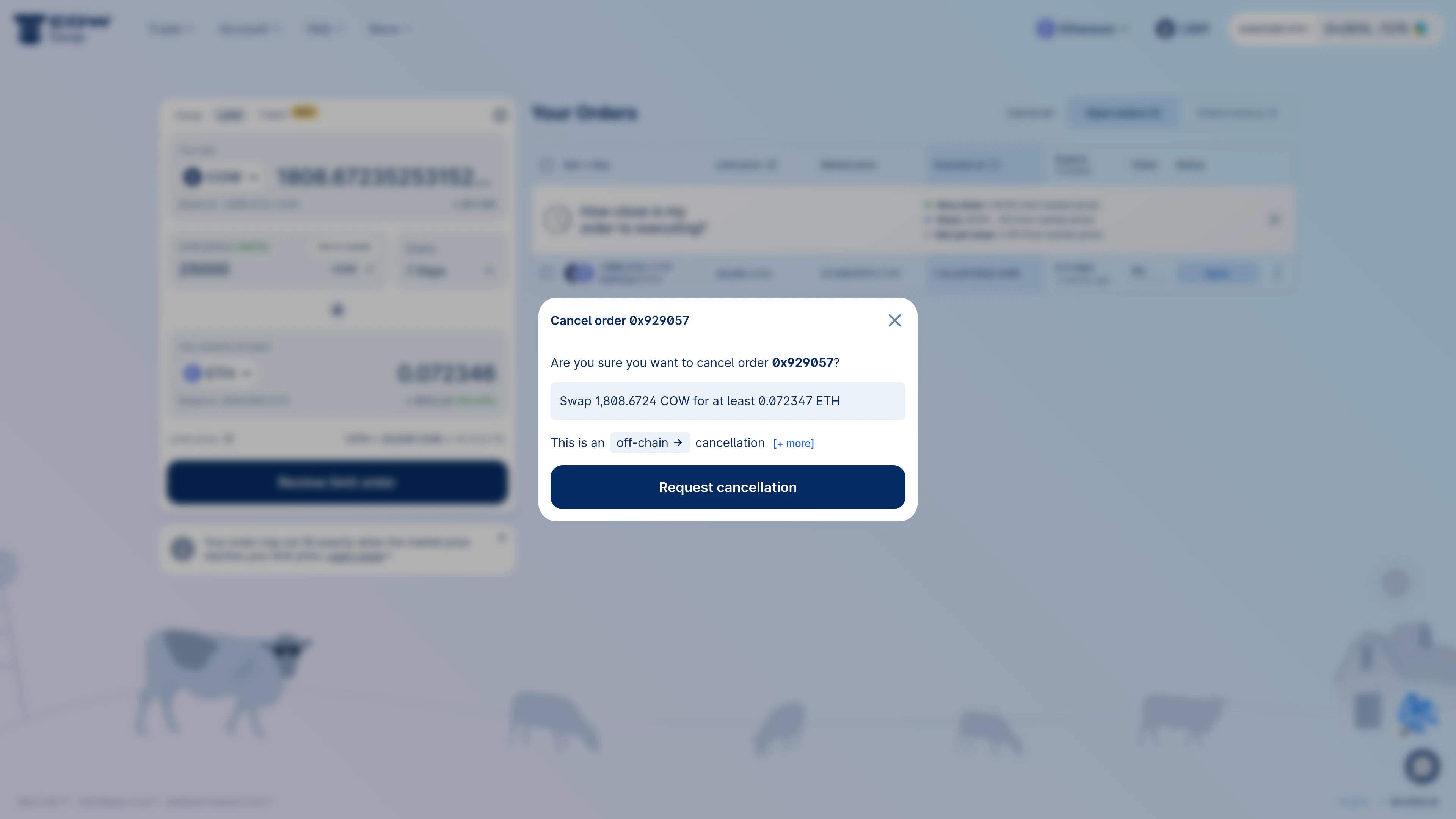 Now we’ve been doing some thinking and realised we shouldn’t be sellingCOW, so we want to cancel our limit order. We can do this by clicking the context menu on the order and selecting “Cancel order”:
